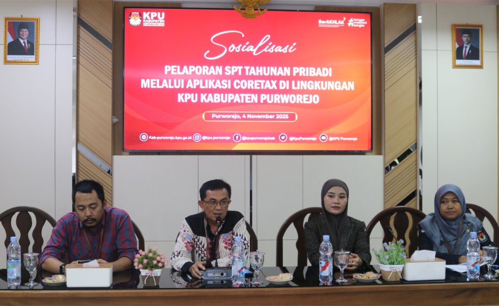 PURWOREJO, – Komisi Pemilihan Umum (KPU) Kabupaten Purworejo pada hari ini, Selasa, 4 November 2025, melaksanakan kegiatan Sosialisasi Pelaporan SPT Tahunan Pribadi melalui Aplikasi Coretax di Lingkungan KPU Kabupaten Purworejo. Kegiatan ini bertempat di Aula Kantor KPU Kabupaten Purworejo dan diikuti oleh seluruh jajaran pegawai. Pelaksanaan sosialisasi ini merupakan bagian dari upaya internal KPU Kabupaten Purworejo dalam menjamin akuntabilitas dan kepatuhan perpajakan seluruh aparatur, sejalan dengan program reformasi sistem administrasi perpajakan nasional. Acara dibuka oleh sambutan resmi Ketua KPU Kabupaten Purworejo, Jarot Sarwosambodo, S.E. Dalam sambutannya, Ketua KPU menegaskan pentingnya peran pegawai KPU sebagai panutan dalam menunaikan kewajiban perpajakan dengan memanfaatkan teknologi terbaru. "Adaptasi terhadap sistem Coretax merupakan keniscayaan. Kami berharap seluruh pegawai dapat memanfaatkan momentum ini untuk memahami prosedur pelaporan pajak pribadi yang kini terintegrasi secara digital, sehingga tercipta efisiensi dan transparansi yang optimal," ujar Jarot. Sebagai narasumber, KPU Kabupaten Purworejo menghadirkan perwakilan ahli dari Kantor Pelayanan Pajak (KPP) Pratama Kebumen, yakni Agung Slamet Hariyadi, R.Ari Satria Putra, dan Rahayu Puji Astuti. Narasumber memaparkan secara detail mengenai fitur-fitur utama coretax, langkah-langkah pelaporan Surat Pemberitahuan (SPT) Tahunan Pajak Penghasilan (PPh) Pribadi, serta berbagai kemudahan yang ditawarkan oleh sistem perpajakan terpadu yang baru. Kegiatan ini diharapkan dapat memastikan kesiapan dan kemampuan teknis seluruh pegawai KPU Kabupaten Purworejo dalam melaksanakan kewajiban perpajakan sesuai dengan ketentuan perundang-undangan yang berlaku. ....