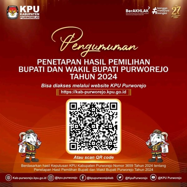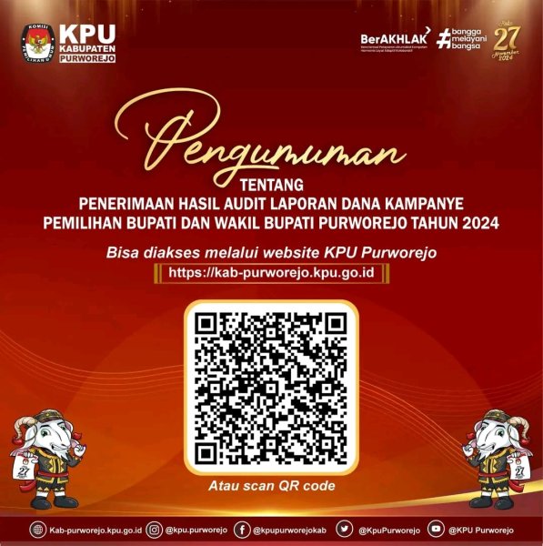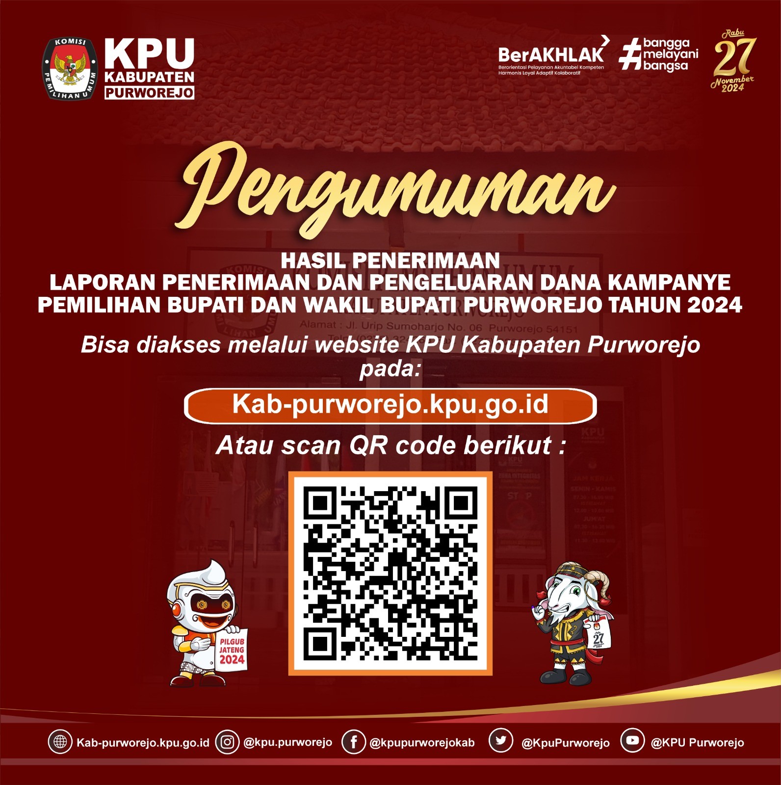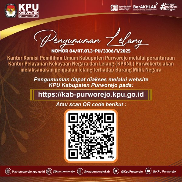 KPU Kabupaten Purworejo akan melaksanakan lelang Barang Milik Negara melalui perantaraan Kantor Pelayanan Kekayaan Negara dan Lelang (KPKNL) Purwokerto dengan cara penawaran terbuka (open bidding) melalui internet, dengan objek berupa Logistik Pasca Pemilihan Serentak Tahun 2024, informasi selengkapnya dapat DIUNDUH DISINI