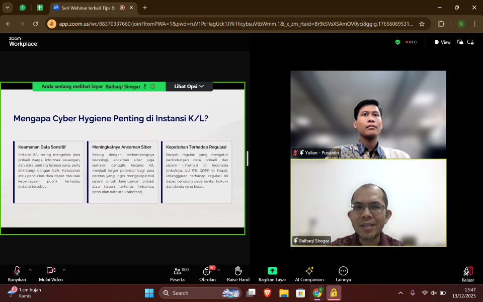 Webinar tersebut menghadirkan Baihaqi Siregar dari Universitas Sumatera Utara (USU) sebagai narasumber. Dalam pemaparannya, ia menyampaikan bahwa penerapan cyber hygiene perlu menjadi kebiasaan dasar bagi setiap pengguna sistem informasi di lingkungan instansi pemerintah.