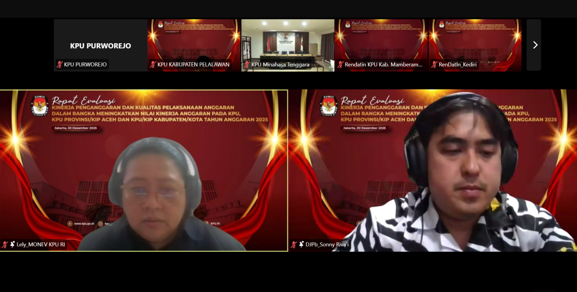Purworejo – Komisi Pemilihan Umum (KPU) Kabupaten Purworejo mengikuti Rapat Evaluasi Penganggaran dan Kualitas Pelaksanaan Anggaran dalam rangka meningkatkan nilai kinerja anggaran pada KPU, KPU/KIP Aceh, serta KPU/KIP Kabupaten/Kota Tahun Anggaran 2025. Rapat dilaksanakan secara daring melalui Zoom Meeting pada Selasa (30/12/2025).