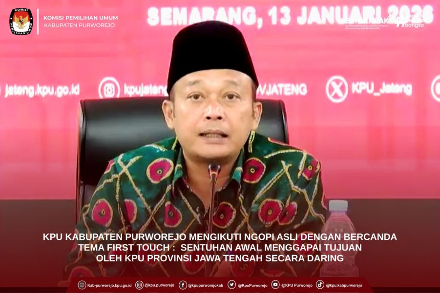 Purworejo – Ketua, Anggota, Sekretaris, serta jajaran Sekretariat KPU Kabupaten Purworejo mengikuti kegiatan Ngopi Asli (Ngobrol Pintar dan Inspiratif) BerCanDa dengan tema “First Touch: Sentuhan Awal Menggapai Tujuan” yang diselenggarakan secara daring oleh KPU Provinsi Jawa Tengah, Selasa (13/1).