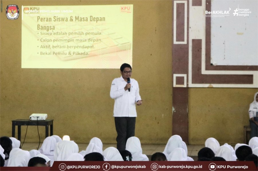 PURWOREJO – Sebagai bentuk penguatan pendidikan politik bagi pemilih pemula, Ketua KPU Kabupaten Purworejo, Jarot Sarwosambodo, S.E., hadir sebagai pemateri dalam kegiatan Orasi Terbuka dan Pemilihan Ketua OSIS (Pilketos) di Aula SMK Negeri 1 Purworejo, Senin (26/1/2026).