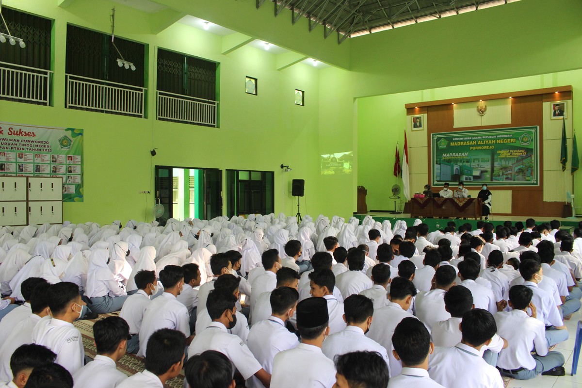 PENDIDIKAN PEMILIH - KPU Kabupaten Purworejo melakukan giat Pendidikan Pemilih (Voter Education) kepada pemilih pemula di MAN Purworejo (Senin, 13 Juni 2022). Hadir sebagai narasumber Imam Turmudi, S.Sy., MSI dan Akmaliyah S.Pd.I, M. Pd., selaku anggota KPU Kabupaten Purworejo. Pendidikan Pemilih ini diikuti oleh siswa kelas XI dari berbagai jurusan. Progam ini merupakan kegiatan rutin KPU Purworejo yang bertajuk KPU Goes To School dengan tema “Peran Siswa dalam mensukseskan Pemilu dan Pemilihan Serentak Tahun 2022”. Para siswa mengikuti kegiatan dengan penuh antusias, hal ini dibuktikan dengan banyaknya pertanyaan yang diajukan oleh siswa seputar kepemiluan. Kegiatan ini juga disambut baik oleh H. Sodikun S.Ag, M.Pd.I selaku kepala madrasah Negeri (MAN) Purworejo. Beliau menuturkan, “Pendidikan semacam ini sangat dibutuhkan bagi siswa siswi MAN Purworejo khususnya kelas XI (sebelas), karena pada tahun 2024 mereka sudah mempunyai hak suara untuk memilih kandidat atau calon pemimpin yang mencakup anggota DPR, Presised dan Wakil Presiden serta DPD”. Kegiatan dimulai pukul 7.30 hingga purna pukul 9.00 di gedung AULA MAN Purworejo.