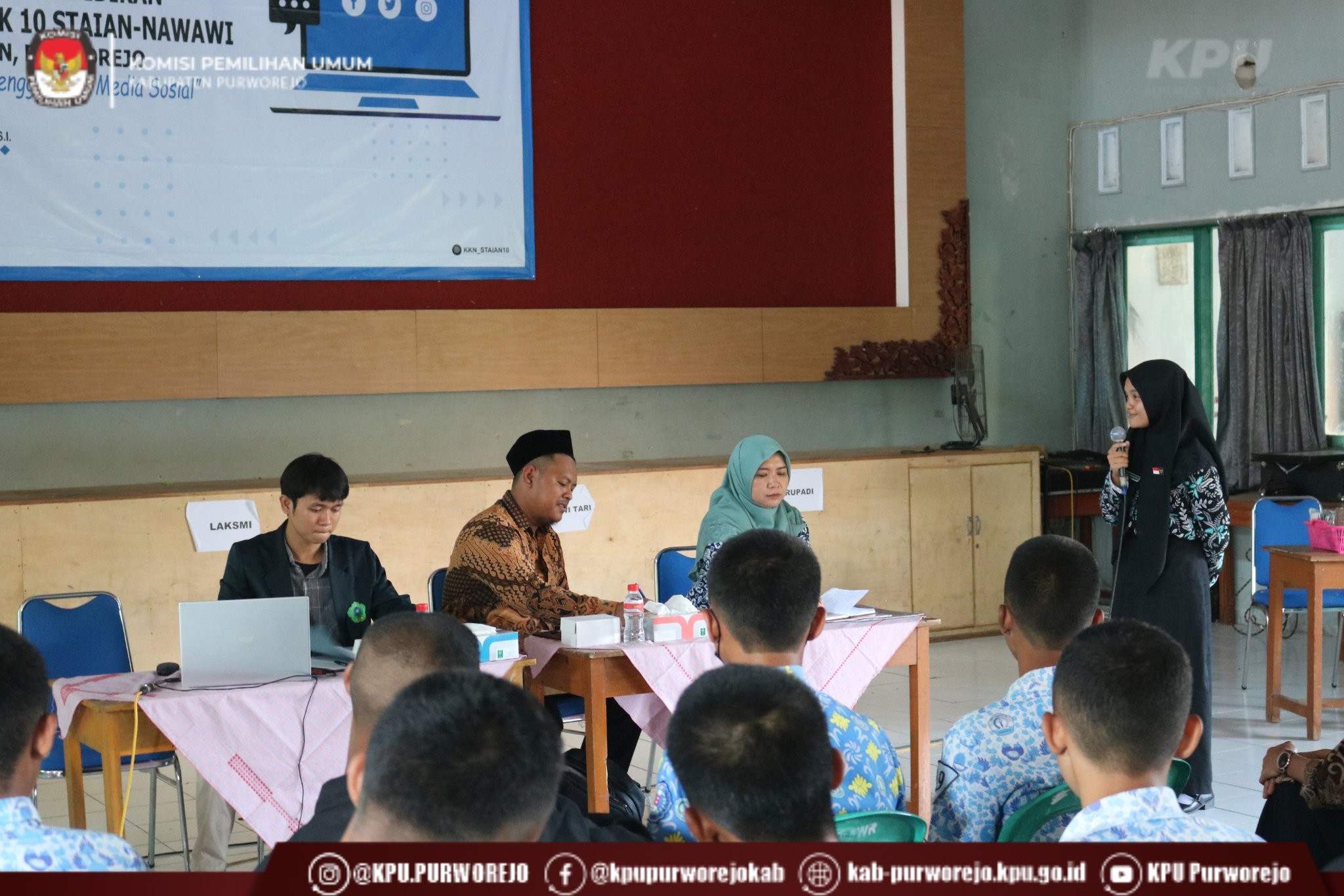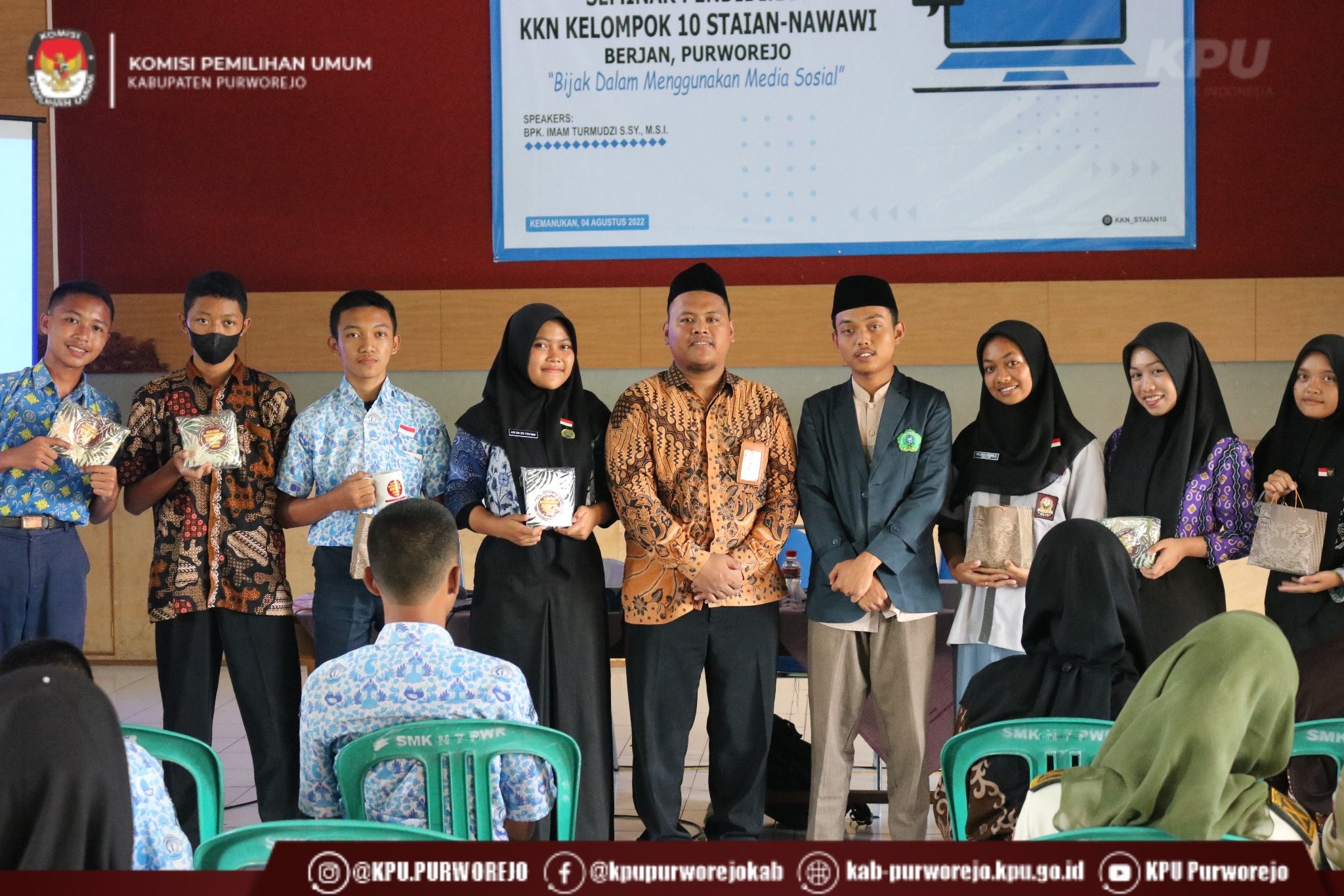 Kamis, (4/8) KPU Kabupaten Purworejo melaksanakan giat Pendidikan Pemilih "KPU Goes To School" kepada pemilih pemula SMKN 7 Purworejo. Dalam giat kali ini KPU bekerjasama dengan mahasiswa KKN Sekolah Tinggi Agama Islam An-Nawawi (STAIAN) Purworejo. Anggota Divisi Sosialisasi, Pendidikan Pemilih, Partisipasi Masyarakat dan SDM, Imam Turmudi, S. Sy., M.S.I hadir sebagai narasumber beserta staf pelaksana subbag TPPP dan Hubmas Sektretariat KPU Kabupaten Purworejo. Pemilihan Umum (Pemilu) tahun 2024 yang tahapannya sudah dimulai sejak beberapa waktu lalu merupakan hajat seluruh warga negara tak terkecuali generasi millenial. Seluruh lapisan masyarakat dapat berperan untuk menentukan arah bangsa dalam pesta demokrasi tersebut.