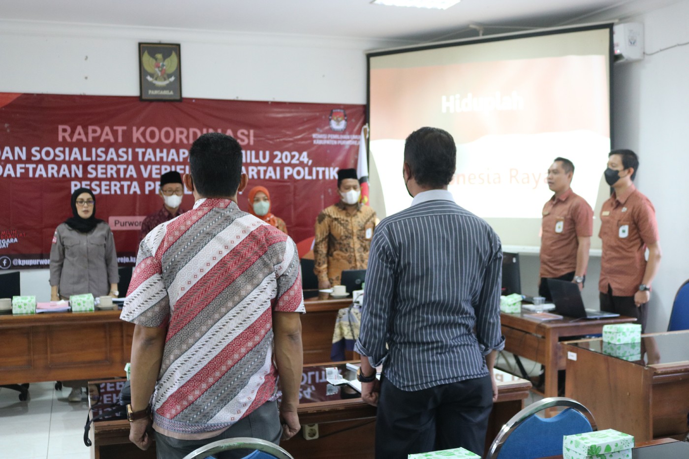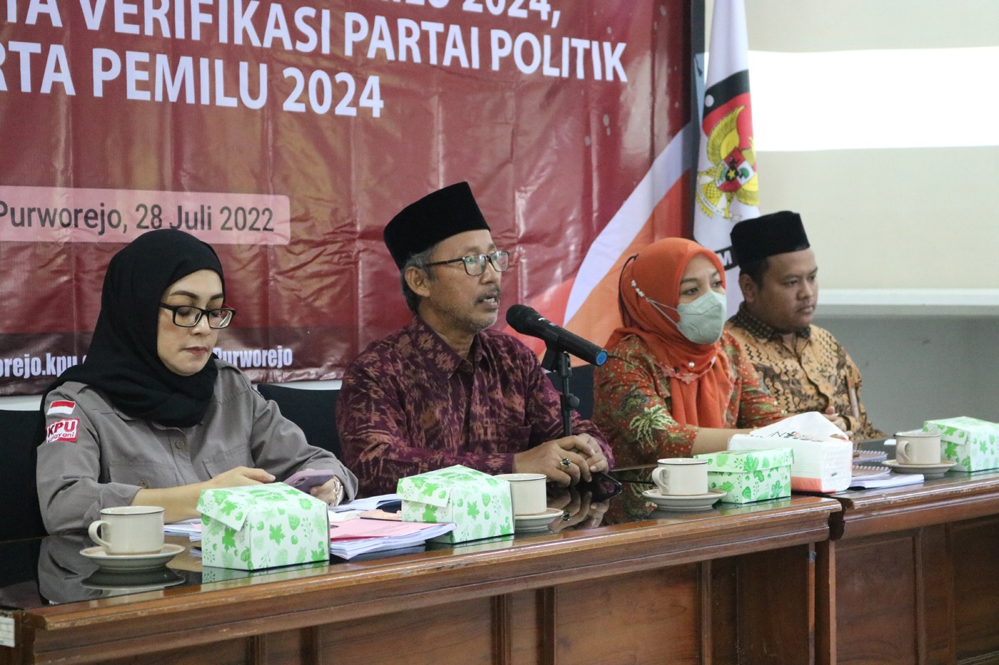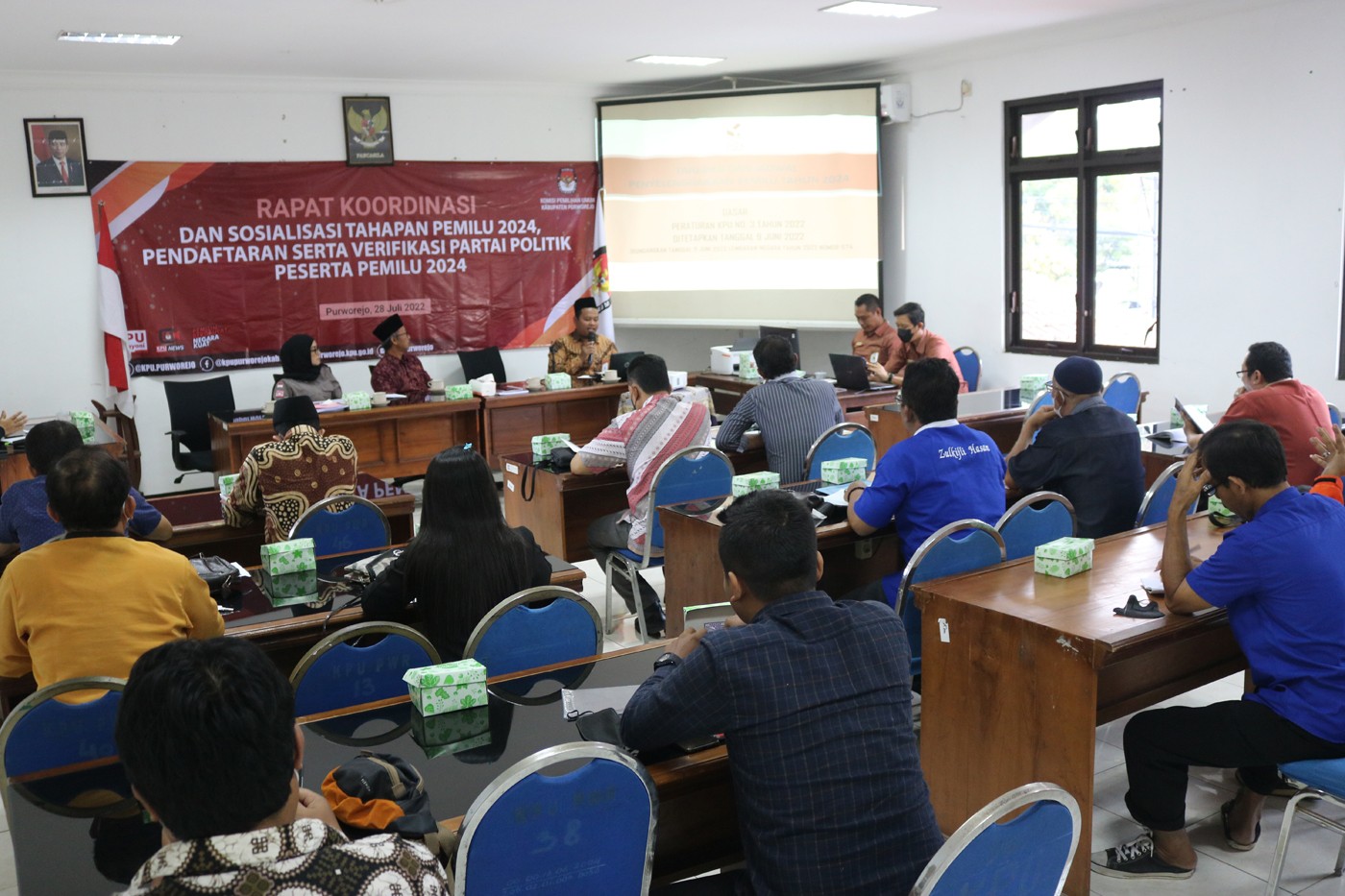 Kamis 28 Juli 2022, KPU Kabupaten Purworejo menyelenggarakan Rapat Koordinasi dan Sosialisasi Tahapan Pemilu 2024 dan Pendaftaran, Verifikasi dan Penetapan Partai Politik Peserta Pemilu 2024. Acara tersebut dihadiri oleh partai politik di Kabupaten Purworejo, baik partai politik peserta Pemilu 2019 maupun partai politik baru. Selain itu hadir pula stakeholder terkait, bawaslu Kabupaten Purworejo, dan perwakilan wartawan.