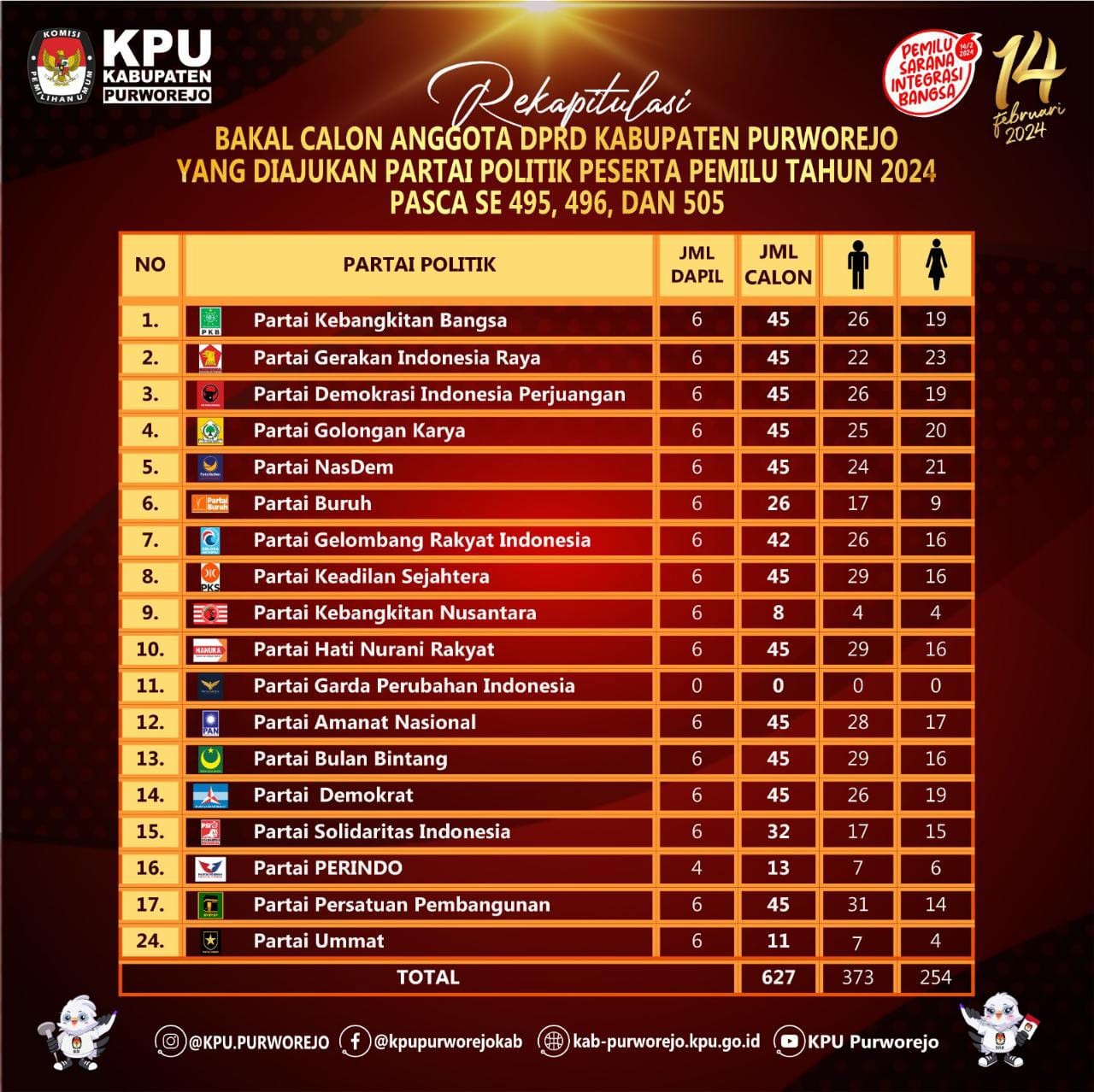 Update rekapitulasi jumlah bakal calon anggota DPRD Kabupaten Purworejo yang diajukan partai politik peserta Pemilu Tahun 2024 pasca SE 495, 496, dan 505