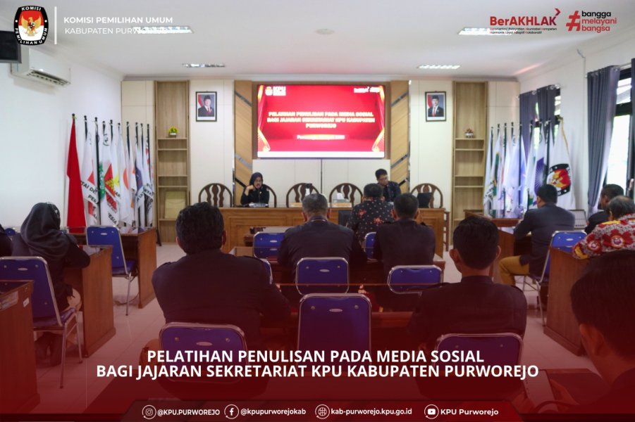 SEKRETARIAT KPU PURWOREJO BERLATIH MENULIS KONTEN WEBSITE KPU Kabupaten Purworejo menyelenggarakan Pelatihan Penulisan Berita Pada Media Sosial Bagi Jajaran Sekretariat Komisi Pemilihan Umum Kabupaten Purworejo bertempat di Aula KPU Kabupaten Purworejo, Rabu 23 April 2025. Hadir dalam pelatihan tersebut jajaran komisioner dan sekretariat KPU Kabupaten Purworejo. Pelatihan tersebut menghadirkan narasumber Ketua KPU Kabupaten Purworejo, Jarot Sarwosambodo. Dalam paparannya Jarot menyampaikan bahwa sesuai hasil evaluasi di KPU Provinsi Jawa Tengah, KPU kabupaten/kota diinstruksikan untuk semakin meningkatkan pengelolaan website/konten yang dikelola. Sebagai tindak lanjut dari hasil evaluasi tersebut, KPU Purworejo menyelenggarakan pelatihan tersebut. Jarot berharap akan tercipta terobosan dan langkah konkret untuk meningkatkan kualitas website dan media sosial KPU Kabupaten Purworejo. Selain itu, ia juga ditekankan perihal batas waktu dalam mengunggah konten di website dan media sosial KPU Kabupaten Purworejo. “Berita harus ditulis paling lambat 1 x 24 jam setelah peristiwa berlangsung, jadi harus memang harus segera diunggah,” katanya.