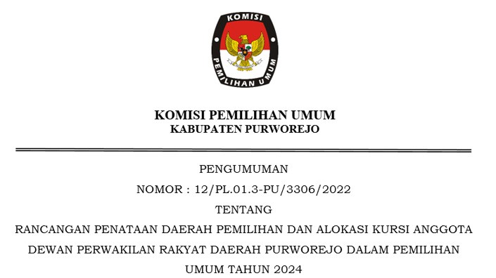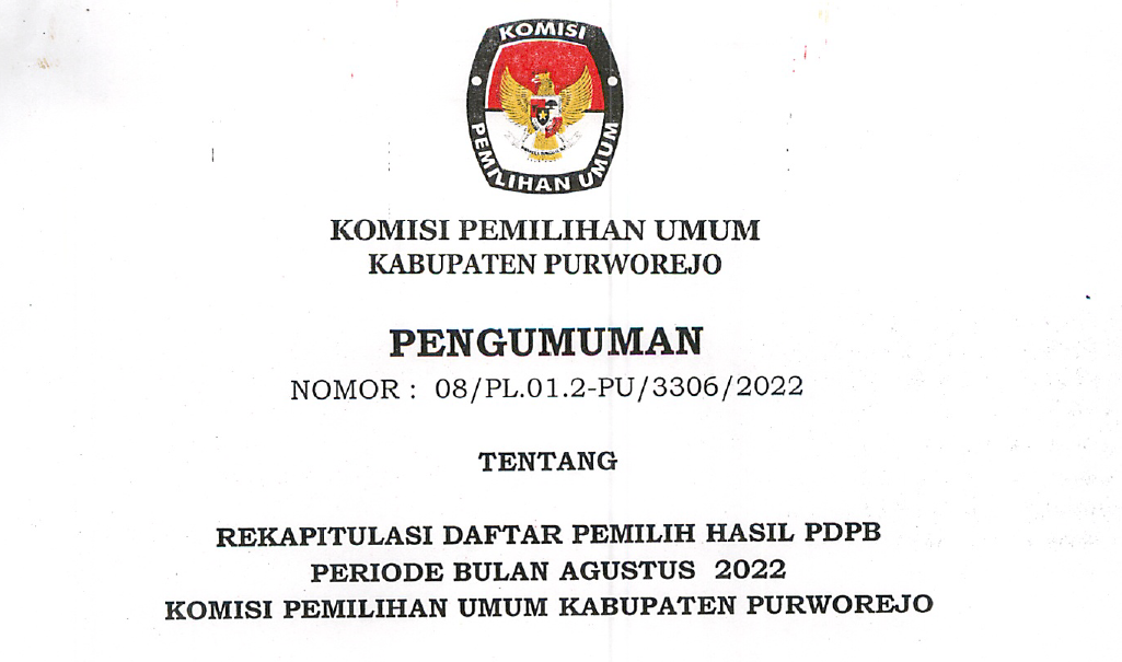Rapat Internal Pemutakhiran Data Pemilih Berkelanjutan KPU Kab. Purworejo, Kamis, 30 Agustus 2022, bertempat di Ruang Komisioner KPU Kab. Purworejo. Rapat dipimpin oleh Ketua KPU, dihadiri oleh anggota KPU, Sekretaris, Kasubag dan staff Sekretariat KPU Kab. Purworejo. Dalam rapat ditetapkan rekap DPB bulan Agustus 2022 sejumlah 305.814 pemilih laki-laki dan 310.606 pemilih perempuan. Jumlah total 616.420 pemilih.