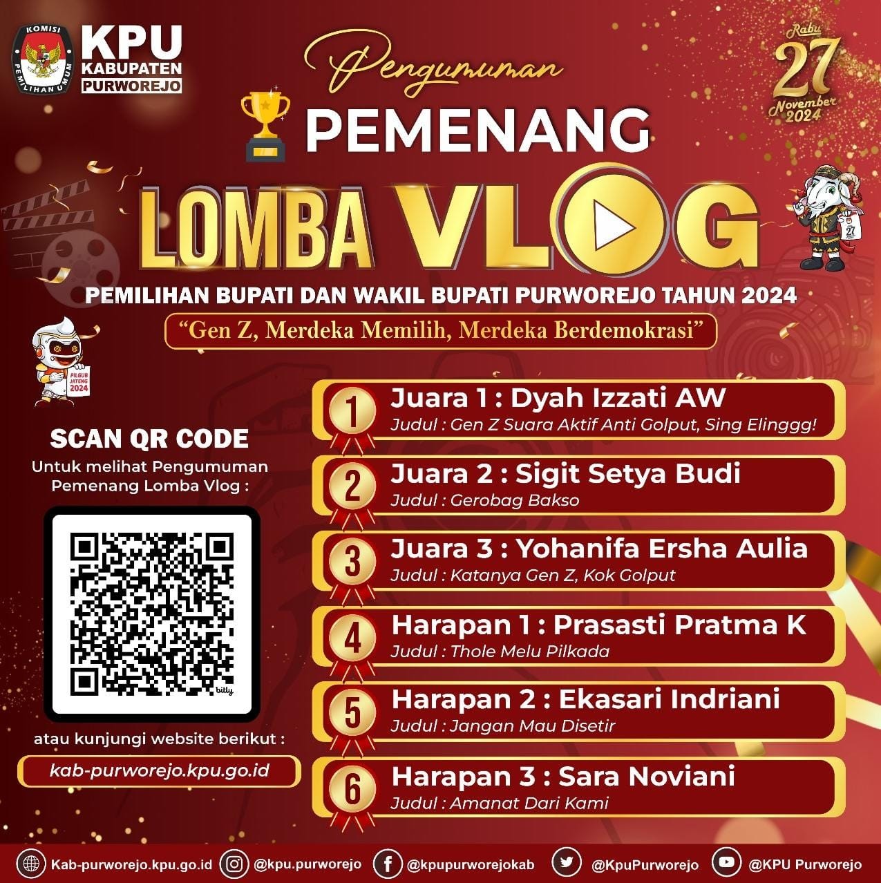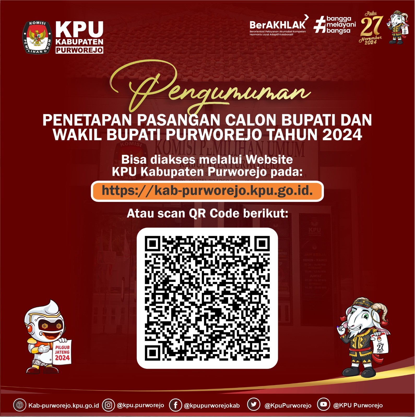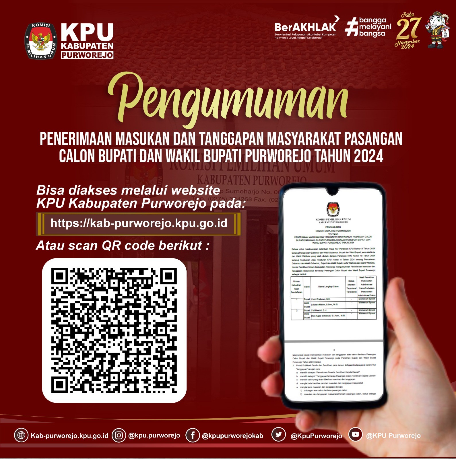 Selain itu, KPU Purworejo juga mempublikasikan tautan bit.ly/visimisipaslonpurworejo yang berisi visi, misi, dan program dari pasangan calon. “Regulasi memerintahkan KPU mempublikasikan dokumen visi misi dengan tujuan mewujudkan keterbukaan informasi dan mendorong partisipasi masyarakat dalam Pilkada 2024,” tegasnya.