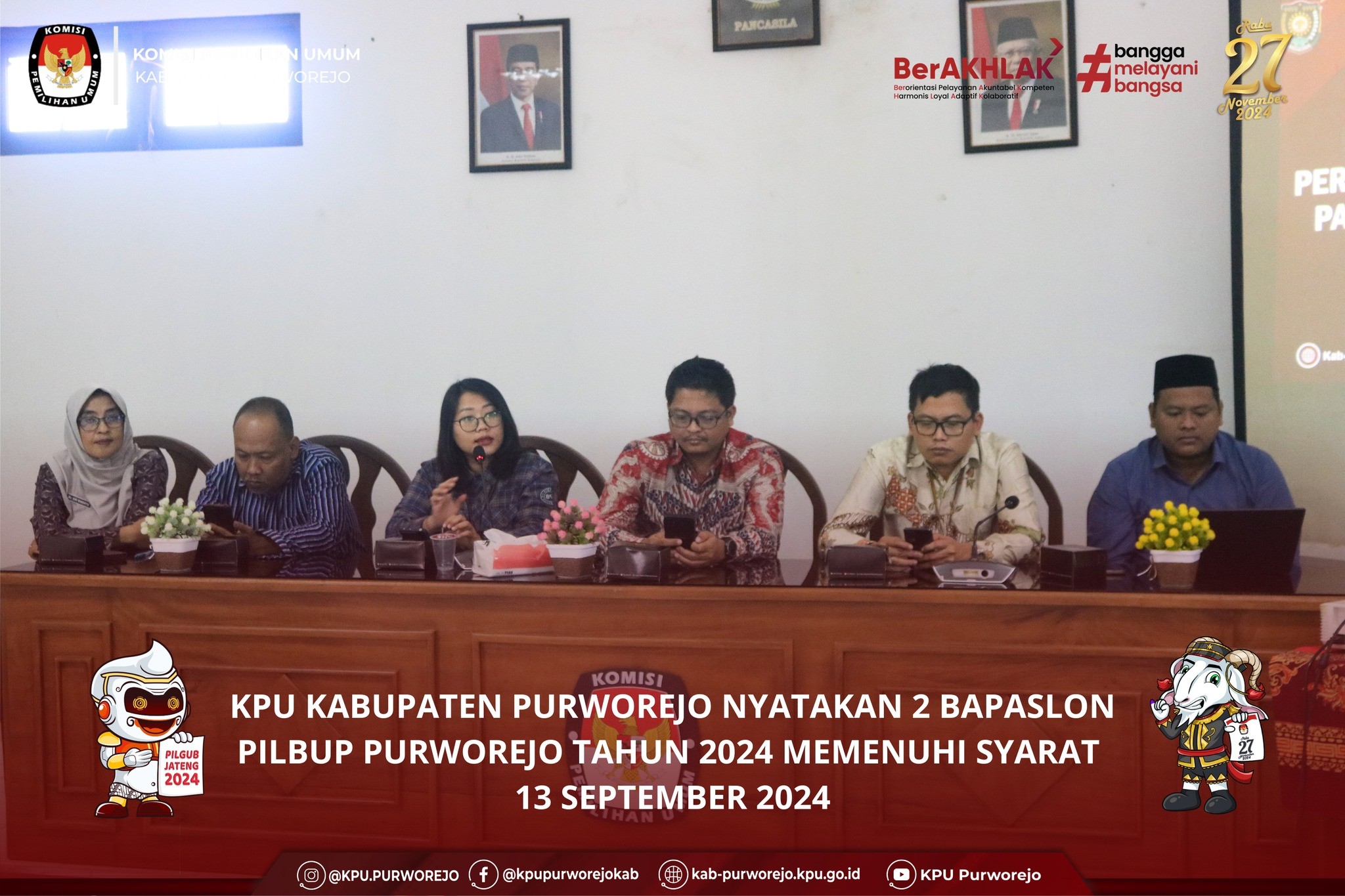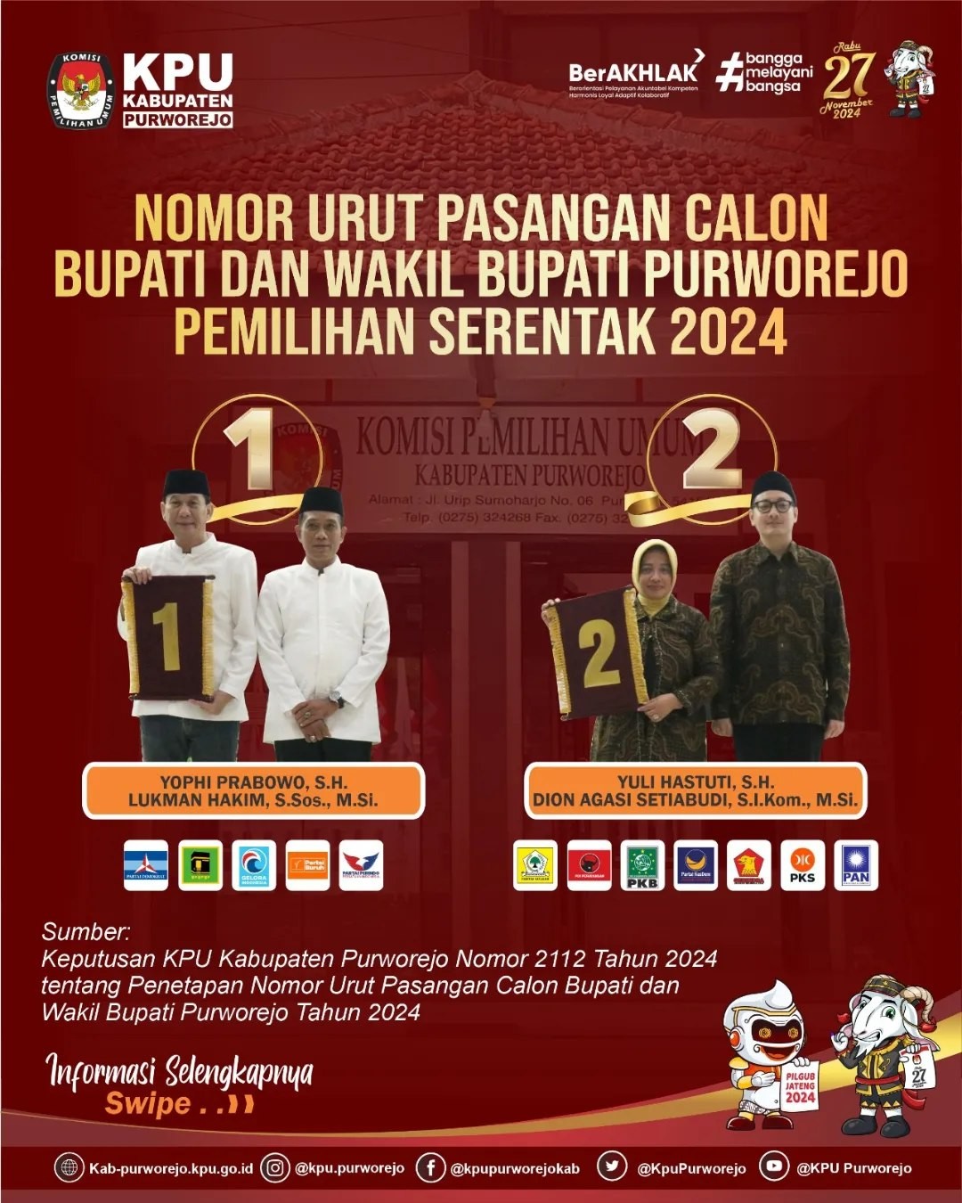 PURWOREJO – KPU Kabupaten Purworejo menyatakan bakal pasangan calon (paslon) bupati dan wakil bupati Yophi Prabowo, S.H. dan Lukman Hakim, S.Sos., M.Si. serta Yuli Hastuti, S.H. dan Dion Agasi Setiabudi, S.I.Kom., M.Si. memenuhi syarat administrasi untuk maju dalam Pilkada Kabupaten Purworejo Tahun 2024. Sebelumnya, KPU Kabupaten Purworejo melakukan proses penelitian administrasi setelah perbaikan dengan diawasi Bawaslu Purworejo.