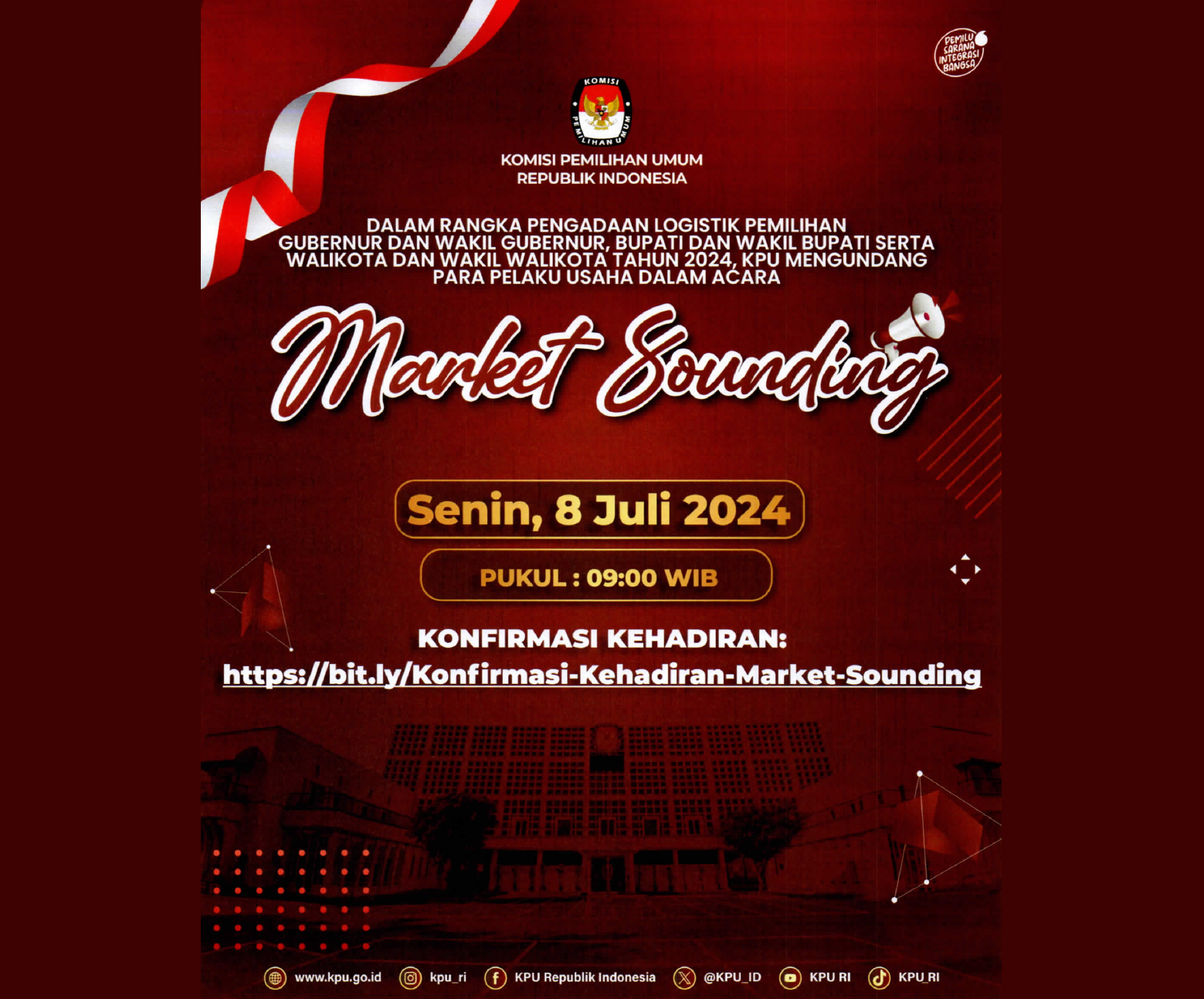 Surat Sekretaris Jenderal KPU Republik Indonesia Nomor 2334/PP.09.2-SD/06/2024 tanggal 28 Juni 2024 tentang Pemberitahuan/Pengumuman Pelaksanaan Kegiatan Market Sounding dalam rangka Pengadaan Logistik Pemilihan 2024 pada Rapat Koordinasi dan Bimbingan Teknis Persiapan Pengadaan Logistik Pemilihan Gubernur dan Wakil Gubernur, Bupati dan Wakil Bupati, serta Walikota dan Wakil Walikota Tahun 2024 dapat diunduh pada tautan berikut ini