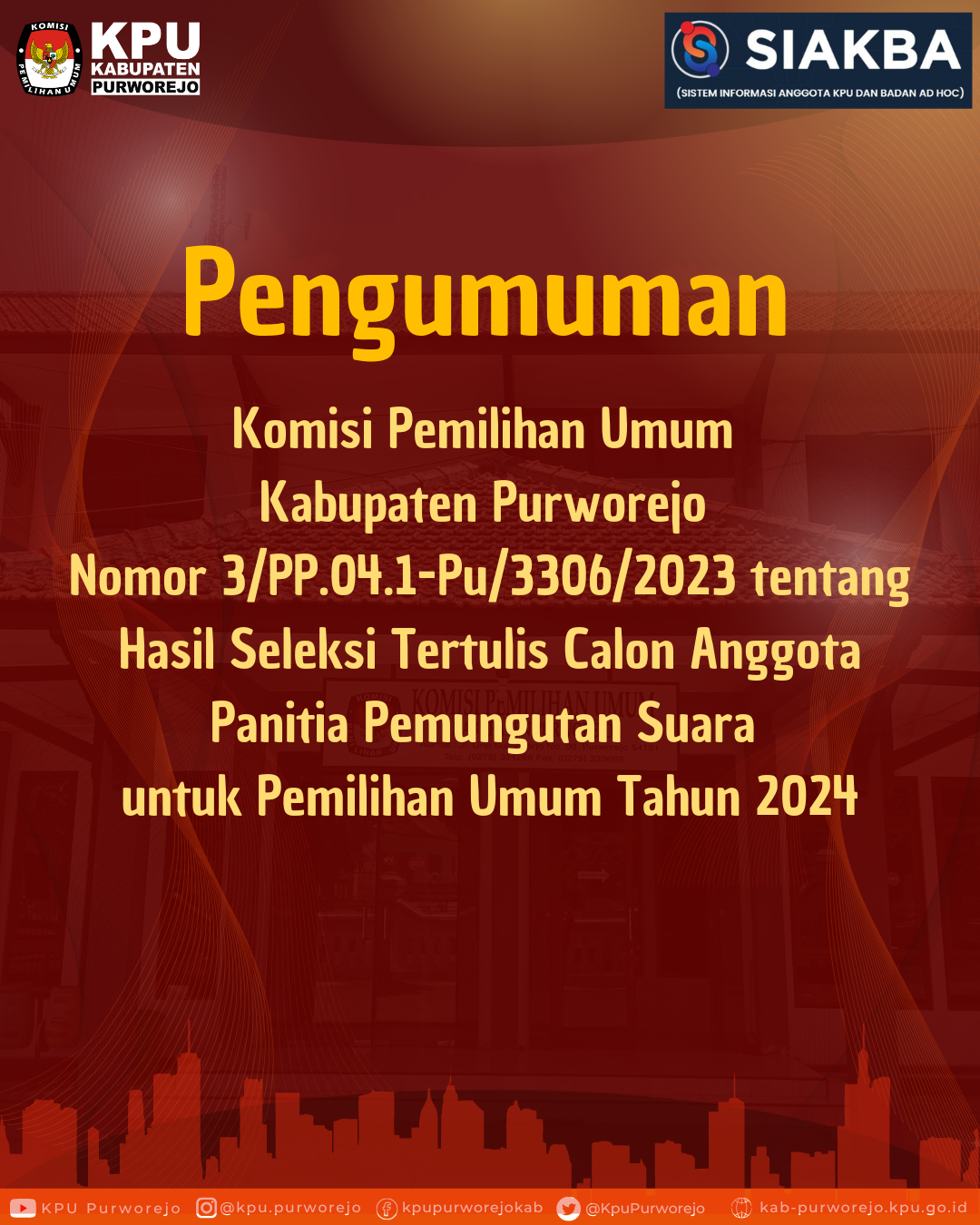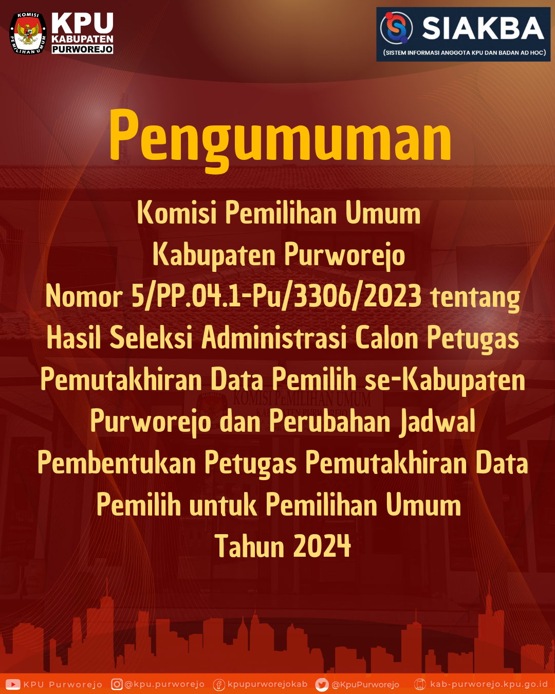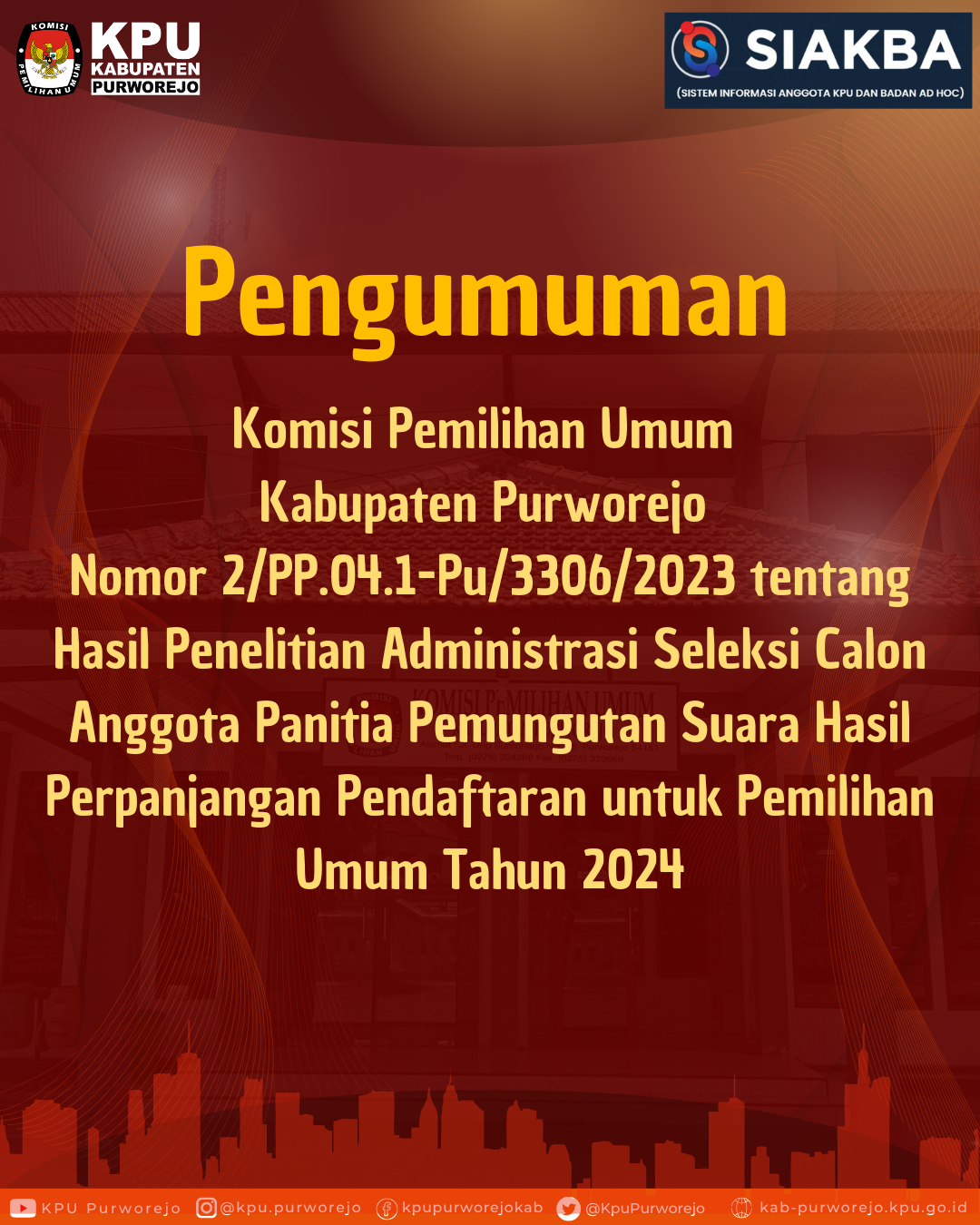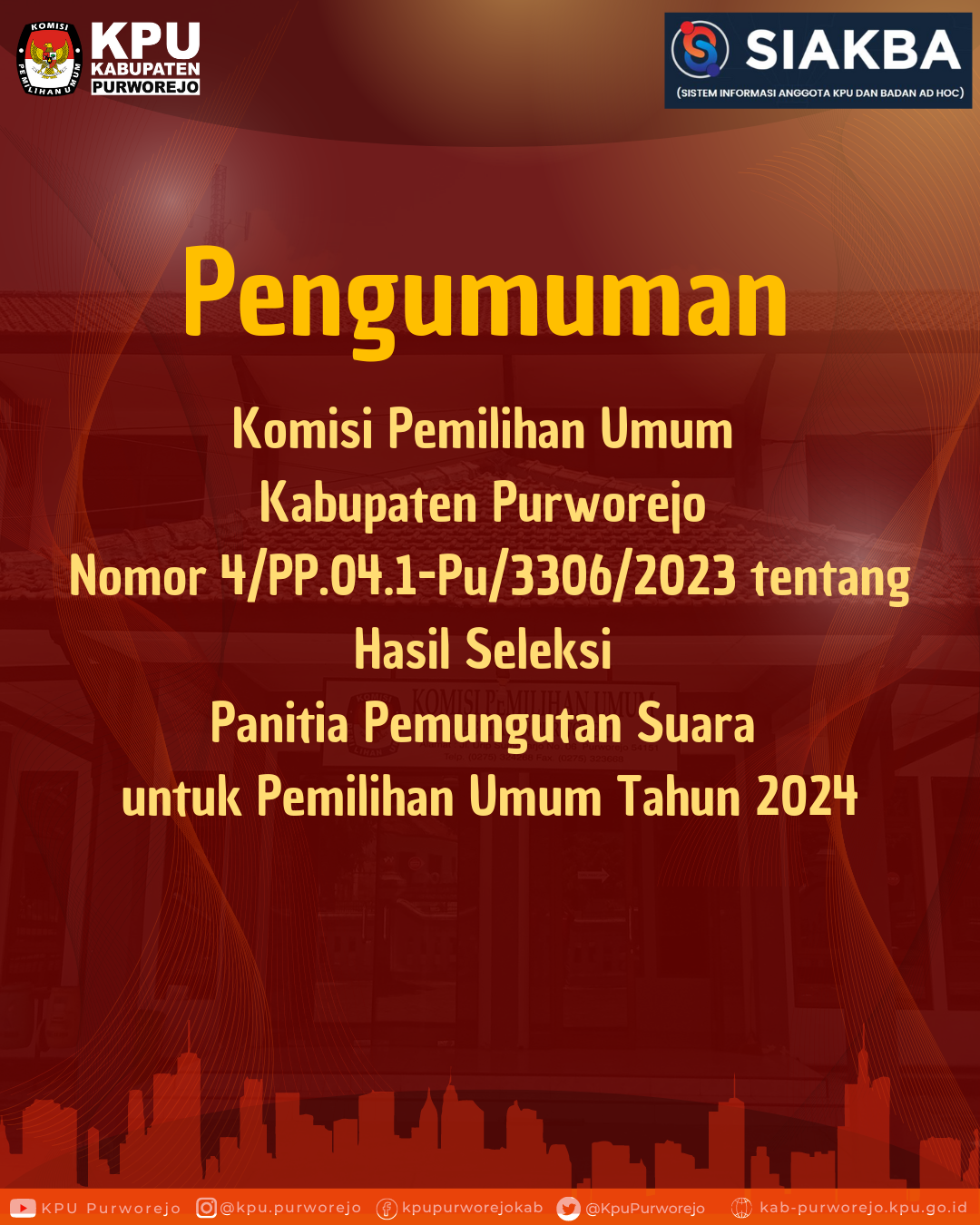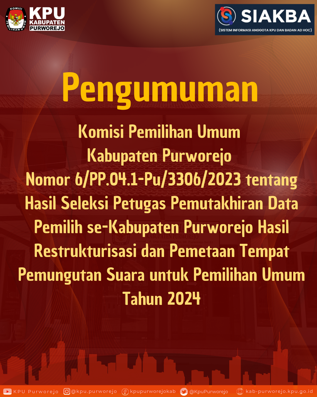 Sehubungan dengan hal tersebut, KPU Kabupaten Purworejo mengundang Calon Anggota PPS untuk hadir dalam Pelantikan, Pengambilan Sumpah/Janji, dan Penandatangan Pakta Integritas Anggota PPS.