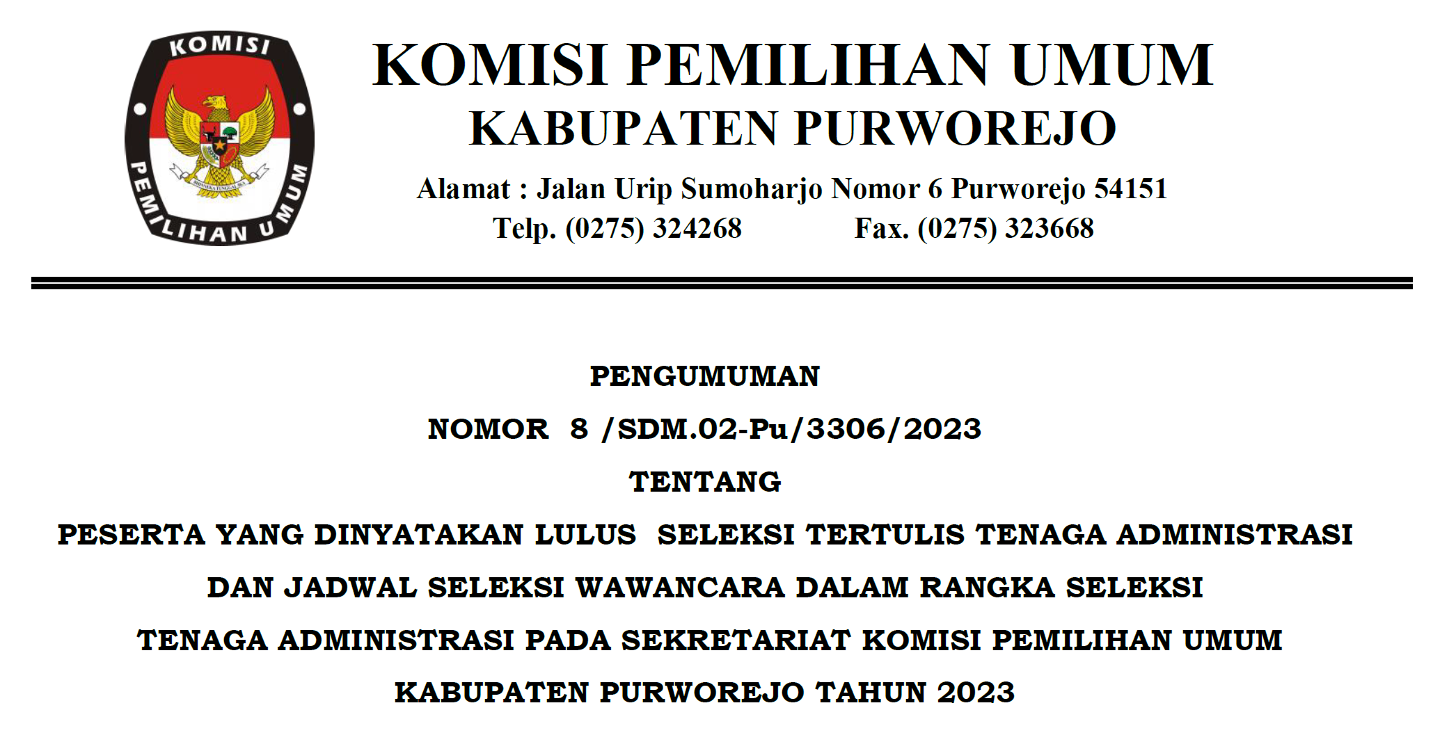 KPU Kabupaten Purworejo menetapkan Calon Anggota PPS peringkat 1-3 sebagai Calon Anggota PPS yang terpilih, dan Calon Anggota PPS peringkat 4-6 sebagai Calon Pengganti Antarwaktu Anggota PPS sebagaimana tercantum dalam Lampiran Pengumuman.